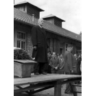 Gedenkveranstaltung in ehemaligen Konzentrationslager Dachau: Teilnehmende Gäste mit Kränzen vor dem ehem. SS-Gebäude 115A , Fotografie: 2. April 1948.