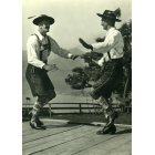 Zwei Schuhplattler in kurzen Lederhosen während des Tanzes an einem bayerischen See (Tegernsee?) vor einem Bergpanorama, Postkarte/Fotografie, um 1925, Augsburg, Haus der Bayerischen Geschichte.