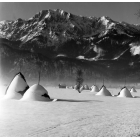Eingeschneite Streuschober (Einstreustroh) im Moorgebiet bei Kochel im Landkreis Tölz; im Hintergrund die Berggipfel Herzogstand (links) und Heimgarten (rechts). Fotografie: 14.3.1965.