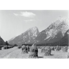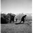 Heuernte in Mittenwald: Drei Personen (Knecht, Magd und Kind) mit Gabel und Rechen. Im Hintergrund das Wetterstein- oder Karwendelgebirge, Fotografie: Mai (?) 1936-1940.
