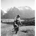 Heuernte in Mittenwald: Magd (Bäuerin?) in Tracht mit Sense bei der Feldarbeit. Im Hintergrund das Wetterstein- oder Karwendelgebirge, Fotografie: Mai (?) 1936-1940.