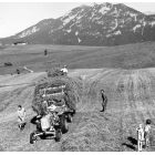 Heuernte bei Oberammergau: Zwei Frauen, ein Mann und Kinder (Familie?) hantieren mit einem Wrasmannkarren, mit dem das Heu zusammengeschoben wird, Fotografie: Mai (?) 1940.