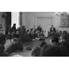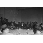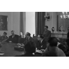 Pressekonferenz in der Staatskanzlei in München: Wilhelm Hoegner und Dr. Philipp Auerbach (Rücken, 3.v.l.) bei Sonderminister Anton Pfeiffer, Fotografie: 11. Juli 1946.