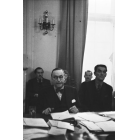 Pressekonferenz des Staatkommissariats für die Betreuung der Juden: Dr. Philipp Auerbach (redend) neben Innenminister Josef Seifried, Vertreter der Jewish Agency for Palestine, Fotografie: 17. September 1946.