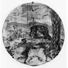 Darstellung einer Bärenjagd (links orientalische Person(?), rechts eine Palme, im Hintergrund eine Burganlage), Schützenscheibe, 2. Hälfte 17. Jh., Tittmoning, Heimathaus des Rupertiwinkels.