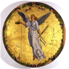Darstellung eines weiß bekleideten Friedensengels mit Palmenzweig und Kranz zum 'Friedens-Fest / Schießen 1871', Schützenscheibe, 1871, Bad Tölz, K.P. Feuerschützengesellschaft.