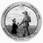 Darstellung eines Kriegsheimkehrers, der vom 'Münchner Kindl' mit Blumen empfangen wird (Umschrift: 'Heimkehr-Schießen 1920...'), Schützenscheibe, 1920, München, K.P. Hauptschützengesellschaft.