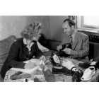 Präsentation der Schuhe in der Schuhfabrik Willi Strasser in der Infanteriestraße 13 in München durch Willi Strasser und Fräulein Ramsperger, Fotografie: 19.5.1949.