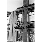 Wiederaufbau in der Münchner Innenstadt am Färbergraben: Bauarbeiter in der Fassade eines zerstörten Hauses (im Hintergrund: Turm der Frauenkirche), Fotografie: Mai 1946.