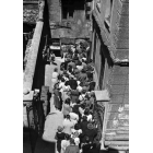 Warteschlange in einem Hinterhof vor der Ausgabestelle für Lebensmittelkarten in München, Fotografie: Juli 1946.