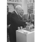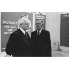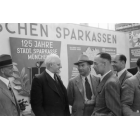 Wirtschaftsminister Dr. Rudolf Zorn (links) als geschäftsführender Direktor des bayerischen Sparkassen- und Giroverbandes auf der Münchner Handwerksmesse, Fotografie: Juli 1949.