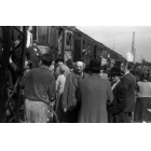 Erste offizielle Ausreise jüdischer Displaced Persons nach Israel vom Güterbahnhof der Funkkaserne in München: Dr. Philipp Auerbach (Mitte) vor den Waggons umgeben von Displaced Persons, Fotografie: 13. Juli 1948.