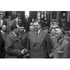 Erste offizielle Ausreise jüdischer Displaced Persons nach Israel vom Güterbahnhof der Funkkaserne in München: Dr. Philipp Auerbach (Mitte) vor den Waggons im Gespräch mit einem Mann in Uniform, Fotografie, 13. Juli 1948.