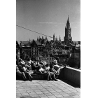 Junge Frauen nehmen ein Sonnenbad auf dem Dachgeschoss eines Hauses in der Theatinerstraße in München (im Hintergrund die kriegsgeschädigte Innenstadt mit Rathausturm), Fotografie, 1946.