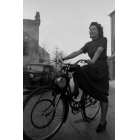 Junge Frau bei der Testfahrt eines Mofas der Münchner Firma Rex-Motorenwerke, Fotografie, Februar 1949.