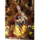 Meister der Blutenburger Apostel, Thronende Muttergottes mit Kind (ehem. Teil des spätgotischen Hochaltars), Holzbildwerk, um 1485, Rottenbuch, ehem. Augustiner-Chorherren-Stiftskirche St. Maria