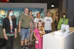 Zuerst eine Donauschifffahrt zur Walhalla, dann ab ins Haus der Bayerischen Geschichte: so sah der Ausflugstag von Familie Greil aus Runding im Landkreis Cham am Mittwoch, 5. August aus. Die Überraschung war groß, als Vater Marco an der Kasse als 100.000ster Besucher im Jahr 2020 und als 600.000ster seit der Eröffnung des Museums von Natascha Zödi-Schmidt, Leiterin des Referats Kommunikation im Haus der Bayerischen Geschichte in Empfang genommen wurde. Mit dabei beim Familienausflug waren Mutter Kathja, die 9-jährige Tochter Johanna, der 15-jährige Sohn Tobi und Sandra, die Schwester von Marco Greil. Ausgestattet wurde die Familie nicht nur mit Freikarten, sondern auch mit einem Geschenkpaket, das neben einigen Publikationen des Hauses der Bayerischen Geschichte den HdBG-Löwen sowie einen Gutschein für das Museumswirtshaus enthielt. So konnte die Familie ihren Besuch gleich auch noch kulinarisch abschließen. Marco Greil freute sich über den Zufall: „Es ist schön, dass ein Bayer hier überrascht worden ist als 600.000ster. Die Ausstellung hat uns super gefallen. Alleine wenn man schon hereinkommt und den Film sieht „Bayern vor 1800“ und dann geht man in die Ausstellung, das ist ein Erlebnis.“