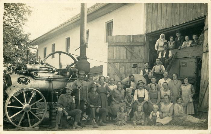 Bewegliche Dampfmaschinen, sogenannte Lokomobile, waren für die Entwicklung der Landwirtschaft von großer Bedeutung. Die Maschinen konnten zu ihrem jeweiligen Einsatzort gezogen werden, wo sie etwa Dreschmaschinen antrieben. Hier präsentiert sich eine Gruppe von rund 20 Erntehelfern mit Kindern und Maschinisten stolz neben der Maschine. Das Foto wurde vom Landschaftsfotografen Georg Bayerl aus Ötzing bei Tiefenbach im Landkreis Passau aufgenommen.