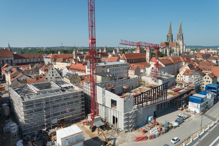 Die Fotos zeigen die Baustelle am Donaumarkt in Regensburg: Hier entsteht das Museum der Bayerischen Geschichte, das 2018 eröffnen wird. Die Aufnahmen wurden zum Richtfest am 10. Juni 2016 fotografiert. Links neben dem Ausstellungshaus wird ein zweites Gebäude, die Bavariathek, gebaut: In der Bavariathek befinden sich Medienlabor, Medienarchiv und Schulungsräume für Projektarbeit.