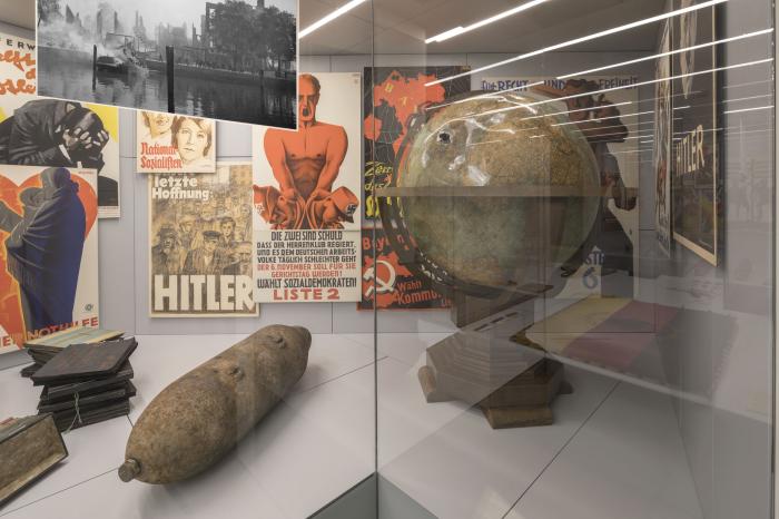 Der Blick auf die Inszenierung zur NS-Diktatur zeigt unter anderem einen Globus. Dieser Globus stammt aus Hitlers Arbeitszimmer im Münchner „Führerbau“. Als Leihgabe der Bayerischen Staatsbibliothek ist er nun im Museum des Hauses der Bayerischen Geschichte in Regensburg zu sehen.