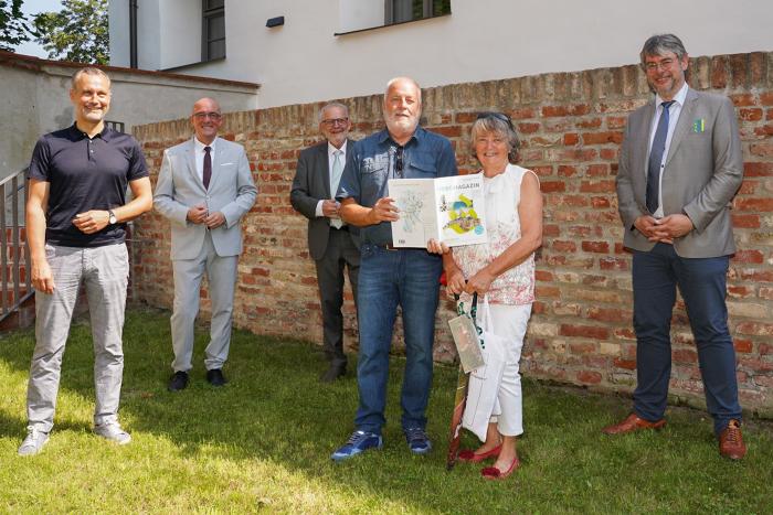 Dr. Peter Wolf, Projektleiter der Bayerischen Landesausstellung, Landrat Dr. Klaus Metzger, Erster Bürgermeister Klaus Habermann aus Aichach und Erster Bürgermeister Roland Eichmann aus Friedberg nahmen am Mittwoch Werner Stenke aus Gundelfingen als 20.000 Besucher mit seiner Ehefrau Claudia in der Bayerischen Landesausstellung „Stadt befreit. Wittelsbacher Gründerstädte“ in Empfang. Mit dabei hatten sie eine voll bepackte Geschenktüte vom Ausstellungskatalog über einen Gutschein fürs Museumscafé und Freikarten für das Haus der Bayerischen Geschichte in Regensburg bis hin zu einem Design-Schirm aus Friedberg.
