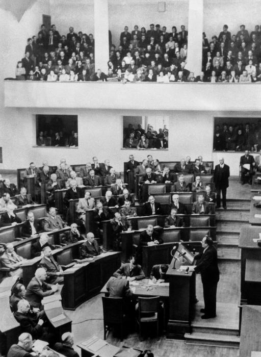 Der Bayerische Landtag lehnte das Grundgesetz ab. Die Entscheidung fiel nach 15-stündiger Debatte in den frühen Morgenstunden des 20. Mai 1949. Die Mehrheit der CSU-Fraktion stimmte mit Nein. Sie befürchtete, dass der Bund als Zentralinstanz die Länder ins zweite Glied drängen könnte. Außerdem rechnete die CSU bei einem Ja mit Einbußen im altbayerisch-konservativen Wählerreservoir, auf das die Bayernpartei unter ihrem Vorsitzenden und früheren CSU-Landwirtschaftsminister Joseph Baumgartner (hier am Rednerpult des Landtags) mit seinem separatistischen Kurs zielte. (Foto: Bildarchiv Bayerischer Landtag)