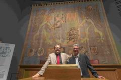 Politik zum Mitmachen: Das Haus der Bayerischen Geschichte hat für das Museum in Regensburg drei historische politische Debatten ausgewählt, an denen sich die Besucherinnen und Besucher des Museums selbst beteiligen und als Landtagsabgeordnete mit abstimmen können. Es sind: Die Abstimmung über das Grundgesetz 1949, das Kruzifix-Gesetz 1995 und das Nichtraucherschutzgesetz 2009. Und das alles auch noch in passender Kulisse. Denn: Im neuen Museum stehen das alte Rednerpult und 18 Abgeordnetenstühle aus dem alten Plenarsaal des bayerischen Landtags. Auch der Hintergrund mit dem monumentalen Wandteppich passt. Vor dem sieben mal sieben Meter großen gewebten Bild wurde von 1950 bis 2004 debattiert, diskutiert, abgestimmt und so manches Gesetz auf den Weg gebracht. Der Teppich wechselte nach dem Umbau des alten Plenarsaals 2007 in den Senatssaal, jetzt hängt er im Museum des Hauses der Bayerischen Geschichte. Er wurde nach einem Entwurf von Professor Hermann Kaspar (1904-1986) in der Münchner Gobelinmanufaktur gefertigt. Kaspar, Professor an der Akademie der schönen Künste, war aufgrund seiner Tätigkeit auch für das NS-Regime in den 1960er-Jahren umstritten.