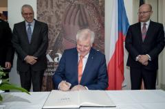 Der Bayerische Ministerpräsident Horst Seehofer trägt sich in das Goldene Buch der Stadt Nürnberg ein. Rechts: der Ministerpräsident der Tschechischen Republik Bohuslav Sobotka / links: der Generaldirektor der Germanischen Nationalmuseums Prof. Dr. G. Ulrich Großmann