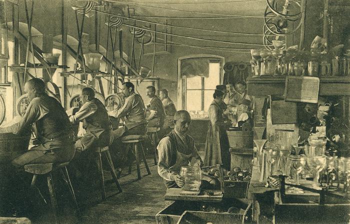 „Fein Glas und gut Holz sind Zwiesels Stolz“, hieß es. Aus heimischen Rohstoffen entwickelte sich ein hochqualitatives Glashandwerk, bei dem die gesamte Produktion am Ort geschah. Die abschließende Veredelung fand in der Schleiferei statt, in welche diese Postkarte einen seltenen Einblick gewährt. Nach eingehender Prüfung jedes einzelnen Stücks wurden die Glaswaren in Städte und an Königshäuser in ganz Europa und darüber hinaus verschickt.