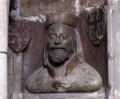 Realistische Porträtbüste Karls IV. (zwischen den Wappen des Heiligen Römischen Reiches und Böhmens) aus dem inneren Triforium des Prager Veitsdoms. Die übrigen 20 Büsten des Zyklus bilden seine Vorgänger, seine Familie, aber auch Angehörige des hohen Prager Domklerus sowie die Dombaumeister Matthias von Arras und Peter Parler ab. Diese Porträtbüsten nehmen in einzigartiger Weise den Individualismus der italienischen Renaissance vorweg.