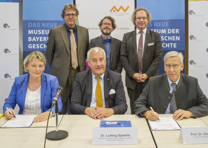 Dr. Richard Loibl, Direktor des Hauses der Bayerischen Geschichte, Prof. Dr. Dieter Müller, OTH Amberg-Weiden, Prof. Dr. Christian Wolff, Universität Regensburg, Prof. Dr. Andrea Klug, Präsidentin der OTH Amberg-Weiden, Dr. Ludwig Spaenle, Bayerischer Staatsminister für Bildung und Kultus, Wissenschaft und Kunst und Prof. Dr. Udo Hebel, Präsident der Universität Regensburg (v.l.o.n.r.u.).