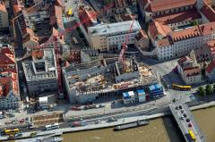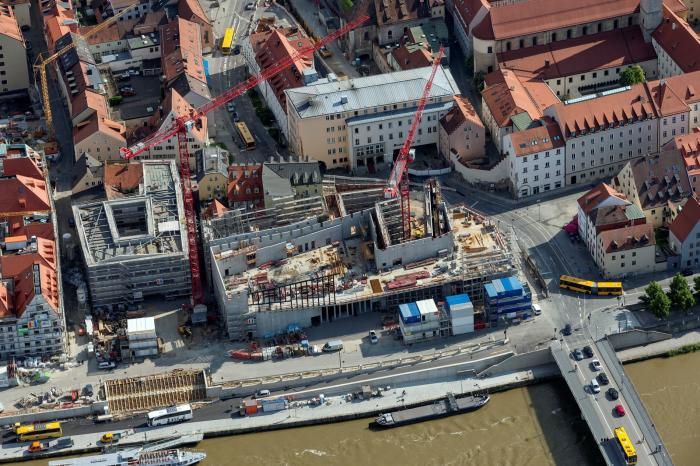 Die Luftbilder zeigen die Baustelle am Donaumarkt in Regensburg: Hier entsteht das Museum der Bayerischen Geschichte, das 2018 eröffnen wird. Die Aufnahmen wurden zum Richtfest am 10. Juni 2016 fotografiert.