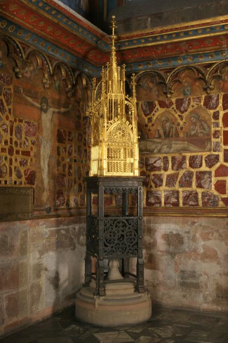 Diese außergewöhnliche Goldschmiedearbeit wurde um 1375 angefertigt, um den eucharistischen Leib Christi aufzunehmen. Der architektonisch geformte Schrein zeichnet sich durch eine Vielzahl detaillierter Muster und Motive aus, die von real existierenden Gebäuden übernommen wurden. Die Turmarchitektur erinnert an die Kathedralchöre der zeitgenössischen, von Peter Parler in den 1380er Jahren vollendeten, gotischen Gotteshäuser.
