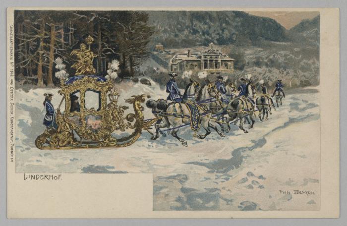 Postkarte/Lithographie mit König Ludwig II. auf Schlittenpartie bei Schloss Linderhof (Fritz Bergen um 1900)