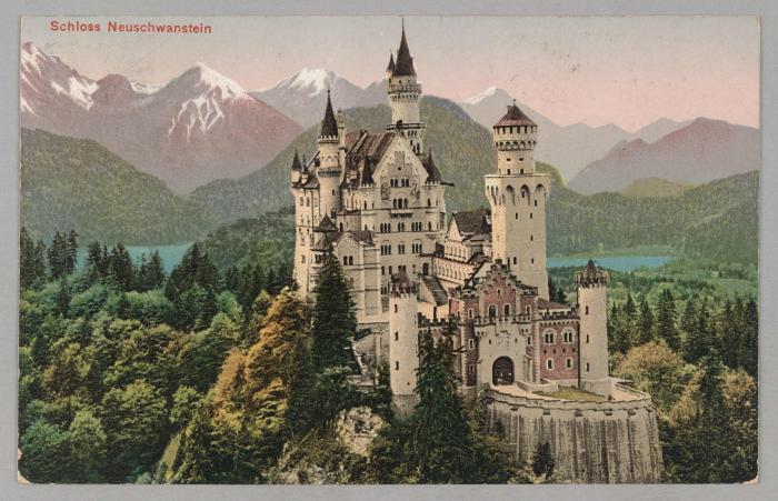 „Wald, Gebirg und Königstraum“: Bereits kurz nach dem tragischen Tod des „Märchenkönigs“ setzte die Vermarktung seiner Schlösser ein – nicht zuletzt, um den daraus entstandenen Schuldenberg abzutragen. Heute sind die Schlösser Ludwigs II. der Magnet für Touristen aus aller Welt und werden überall mit Bayern und Deutschland verbunden. (Postkarte, Haus der Bayerischen Geschichte)