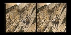 Die sogenannten Kaiserpanoramen waren im 19. Jahrhundert sowohl Vorläufer des Kinos, als auch aktuelle Berichterstattung und virtuelle Reisemöglichkeit. Der Kunde blickte durch ein Okular auf eine Stereoskopie und konnte so dreidimensional zum Beispiel in Landschaften eintauchen. Diese Kletterei auf der Zugspitze stammt aus der Kaiserpanorama Bilderserie zur „Besteigung der Zugspitze durch das Raintal und Höllental, mit Besuch der Höllentalklamm“.