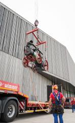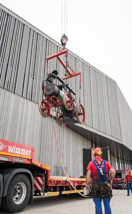 Die Lokomobile, gebaut im Jahr 1921, wurde in das Museum der Bayerischen Geschichte eingebracht. Kran und Schwertransporter waren nötig, damit der Fünftonner wohlbehalten im ersten Obergeschoss des Museums angeliefert werden konnte.