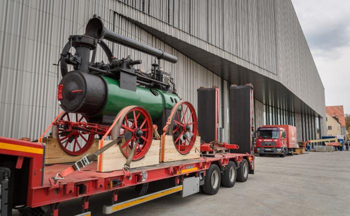 Die Lokomobile, gebaut im Jahr 1921, wurde in das Museum der Bayerischen Geschichte eingebracht. Kran und Schwertransporter waren nötig, damit der Fünftonner wohlbehalten im ersten Obergeschoss des Museums angeliefert werden konnte.