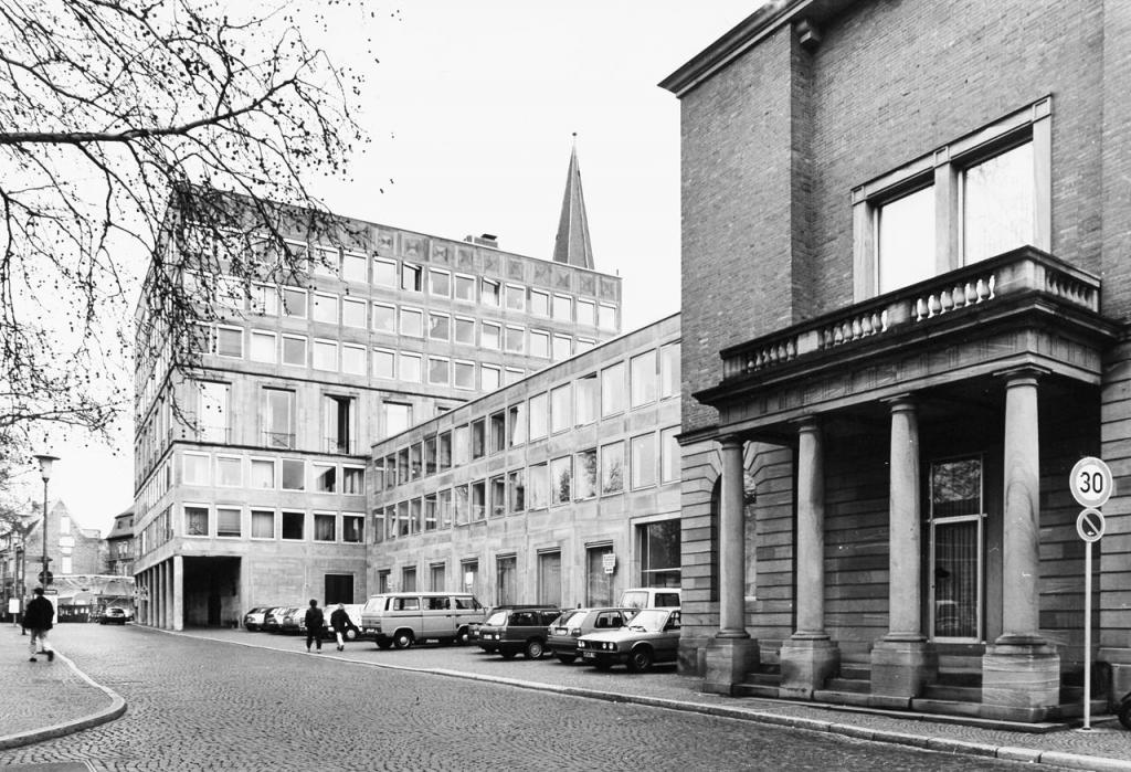 • Neubau eines modernen Rathauskomplexes durch Diez Brandi mit Integration einer Kopie des alten Portikus