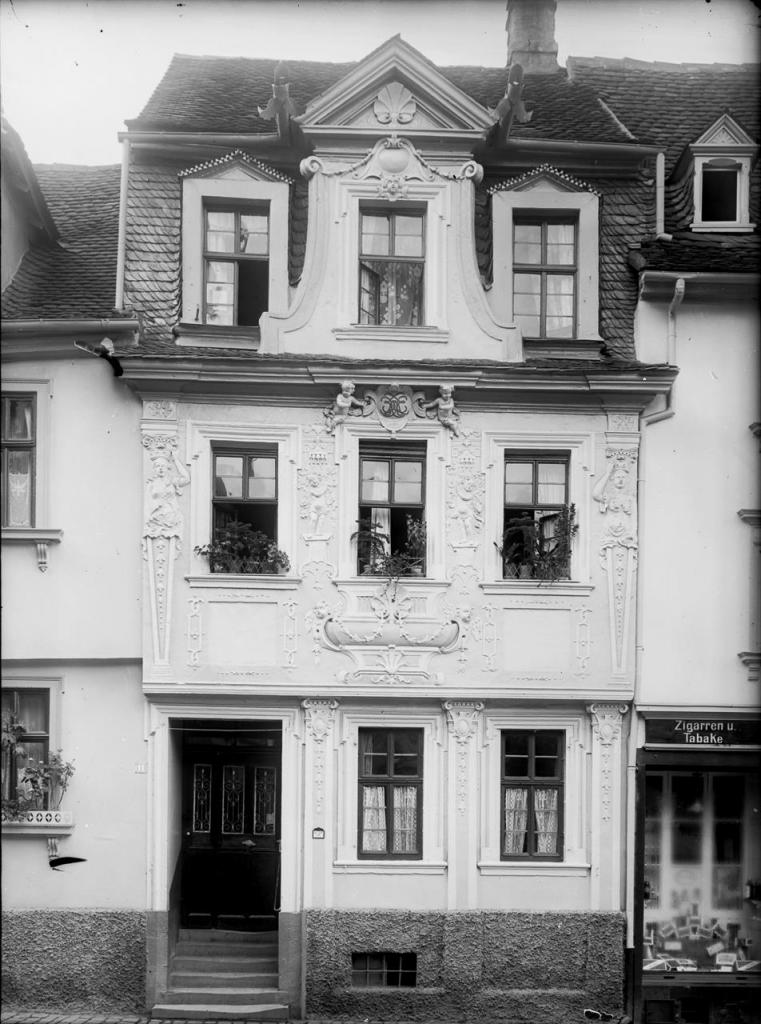 • zweigeschossiges Mansarddachhaus zu drei Achsen mit Ziergiebel und frigürlicher Stuckdekoration