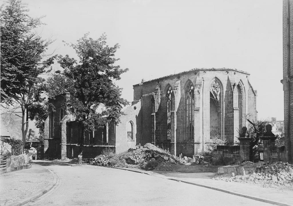 - nördliche Mittelschiffswand der Kirche größtenteils, südliche mitsamt Arkaden vollständig zusammengebrochen, Kirche ausgebrannt und alle Fresken vernichtet