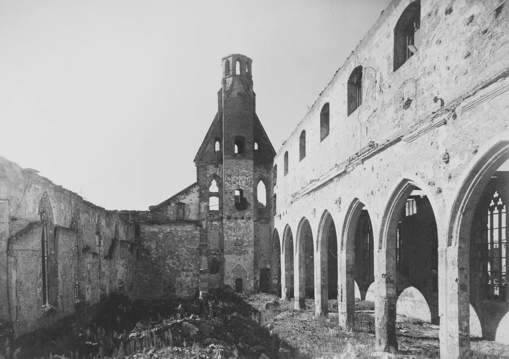 - Kirche ausgebrannt, durch Sprengbomben die Chormauern, die südlichen Seitenschiffmauern und die Arkaden zerstört