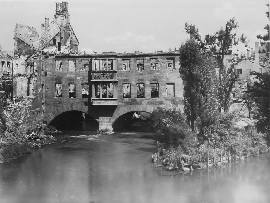 • Brückentrakt nach Wiederaufbau als "Alt Nürnberger" Restaurant genutzt - mit rekonstruiertem Erker aus NS-Zeit