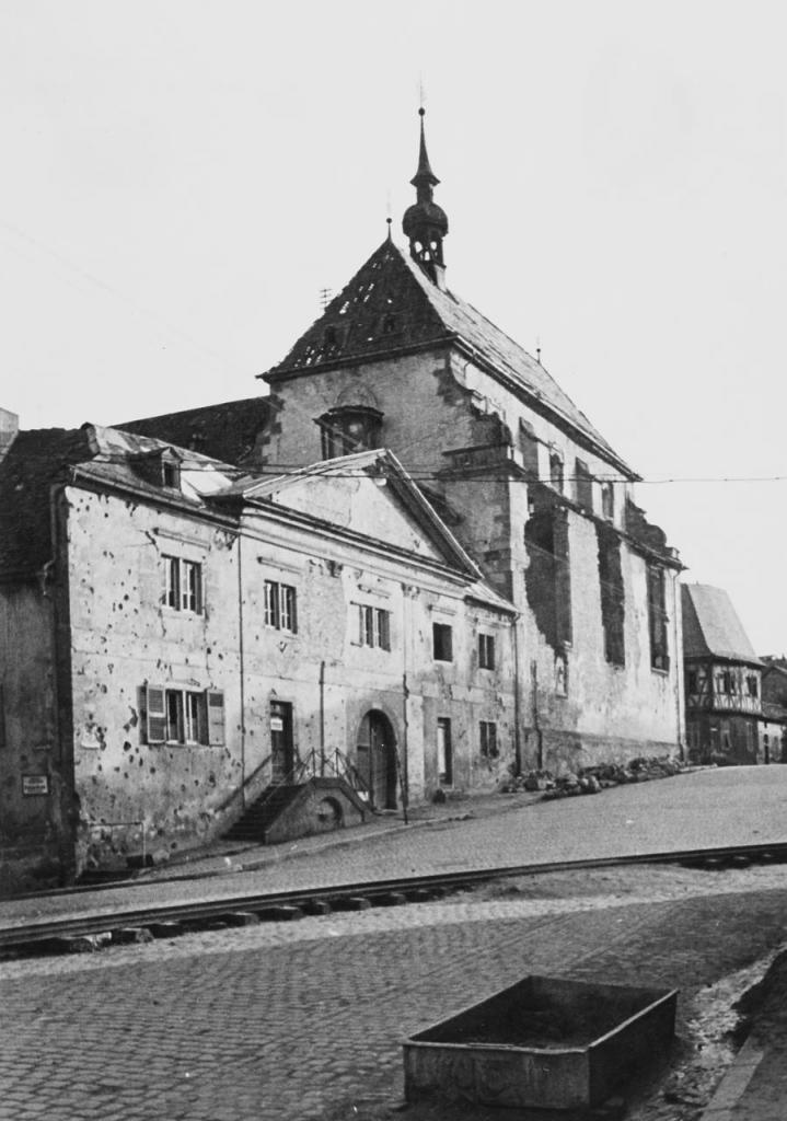 - Kollegiengebäude und Gymnasium bis auf Rest der unteren Fassade zerstört