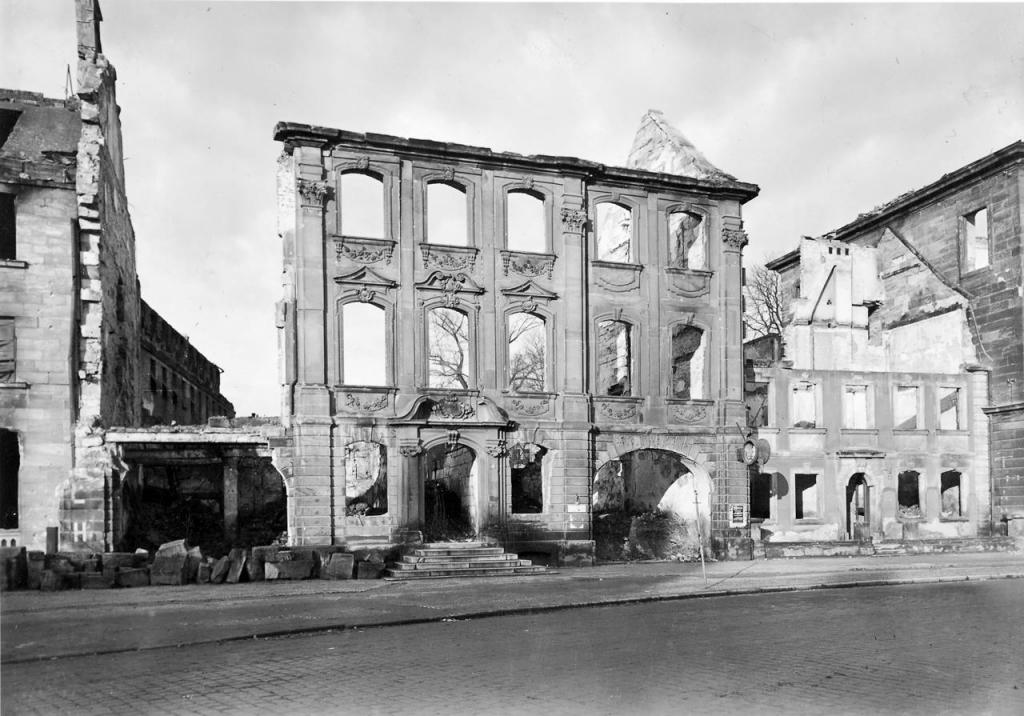 - 14. April 1945: bis auf fünf Achsen der Fassade und Erdgeschoss-Innenmauern zerstört