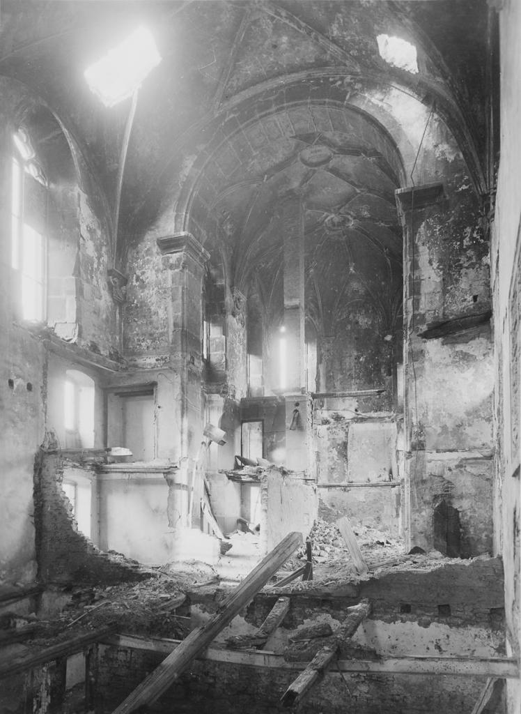 1609-13 durch Lazaro Augustino auf der Grundlage eines Vorgängerbaus ( Mitte 13.Jh.) errichtet, von diesem vier Geschosse des Südturms; einschiffiger Bau mit eingezogenem Chor und netzförmig stuckierter Tonne; im 19 Jh. profaniert und für Wohn- und Ökonomieräume umgebaut.
