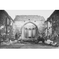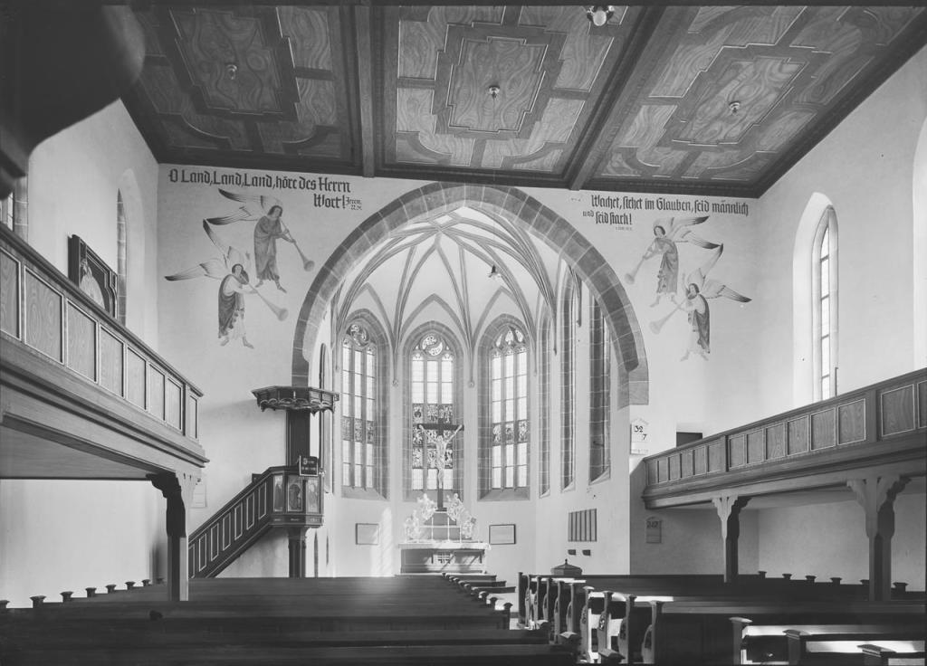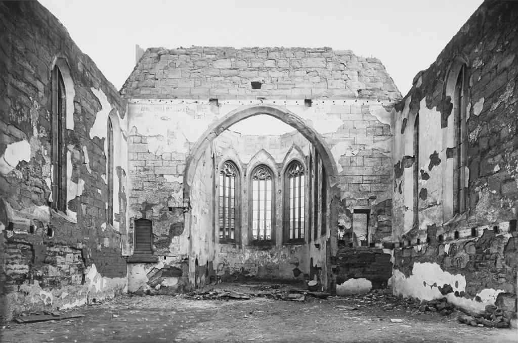 Schwere Schäden: am 18.4.1945 durch Artilleriebeschuss ausgebrannt, Sterngewölbe im Chor eingestürzt und Ausstattung vernichtet