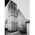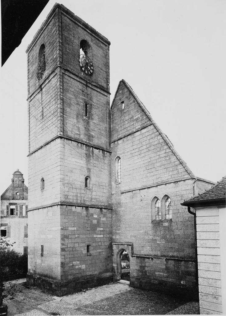 Saalbau mit eingezogenem Chor, ab 1478 erbaut, der Turm 1528; nach Teilzerstörung (1648) 1709-10 Instandsetzung, Chorausbau und Emporeneinbau, 1821 neugotische Innenausstattung, bei Restaurierung 1932-39 purifiziert
