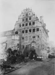 • 1945: Rückflügel schwer beschädigt und später abgetragen, am Vorderhaus Fassaden- und Stuckschäden