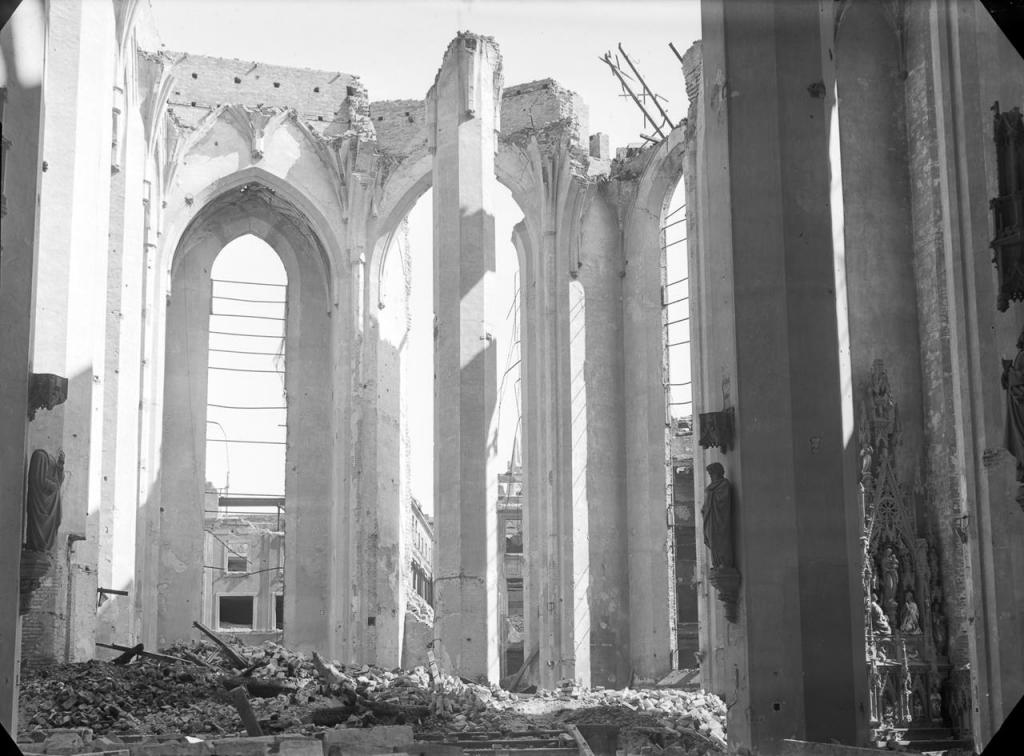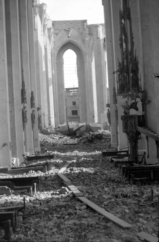 - 9. Oktober 1943, 21. November und 17. Dezember 1944, sowie 7. Januar und 25. Februar 1945: durch Spreng- und Brandbomben Zerstörung des Dachstuhls, der Turmhauben, sämtlicher Haupt- und Seitenschiffgewölbe bis zu den Widerlagern, von fünf Mittelschiffpfeilern einschließlich der Gurt- und Scheidbögen, der Chorumfassungsmauer, der nördlichen Sakristei bis auf die Außenmauern, des Hauptportals und der Fenster der Nordseite, der Portale der Südseite sowie des Maßwerks und der Gewände an den Fenstern des Langhauses